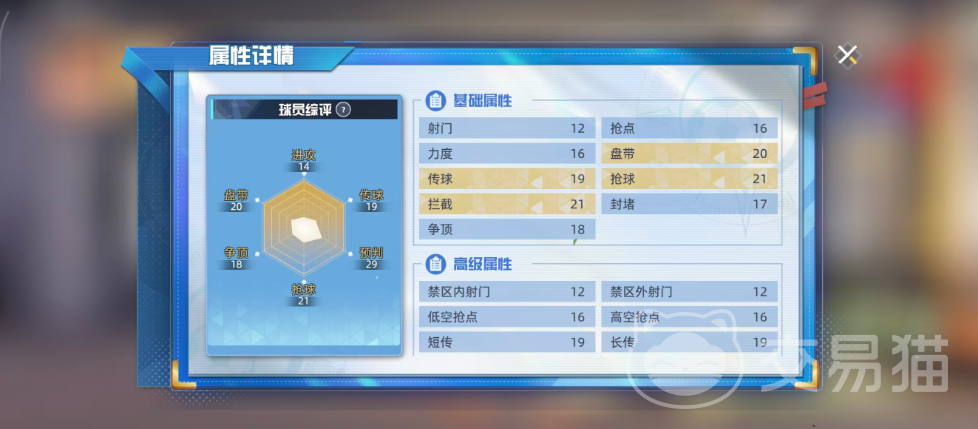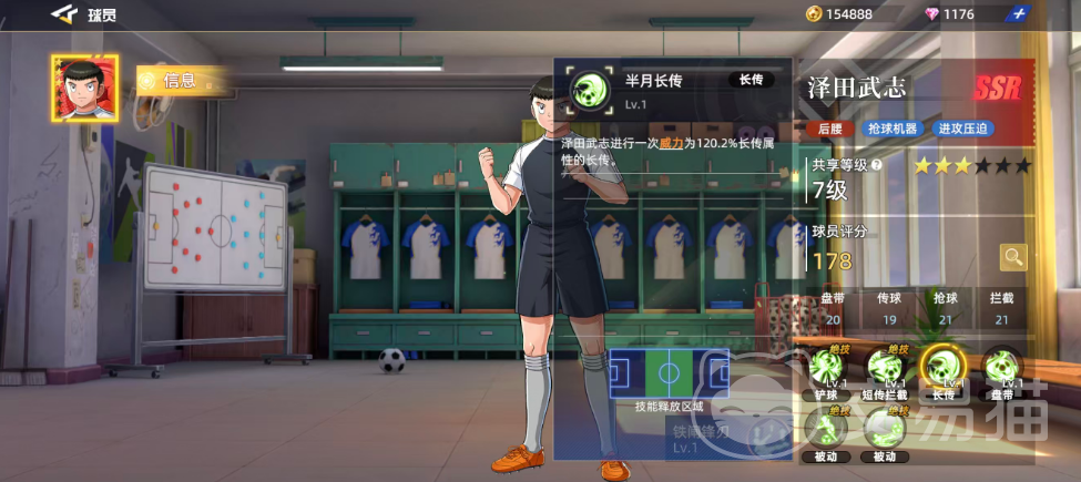 作为一名后腰定位的角色,泽田武志在防守端展现出极强的压迫性和抢断效率。其盘带数值为20,传球能力达到19,抢球与拦截两项关键数据均为21,整体基础评分高达178,远超普通SR级别球员。尤为突出的是他的预判能力,评分达到了29,接近满值水平。此外,在高级属性方面,短传与长传同样拥有19的评分,低空与高空抢点则各有16点数值,体现了他在中场区域的全面覆盖能力。
