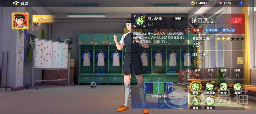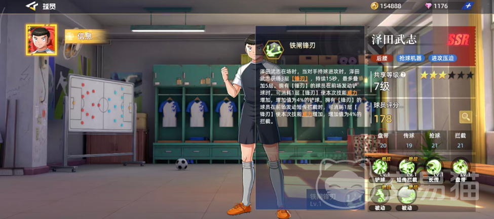 在技能设计上,泽田武志具备“强力铲球”这一核心主动技,释放时可发动一次威力为143%铲球属性的抢断动作,并使对方后场单位减少5.1%的盘带能力,持续时间为15秒,施法区域位于球场中部,适用于打断对手组织进攻。另一项主动技能“预判截断”专注于短传拦截,成功触发后能将【半月长传】技能的蓄力时间缩短36.1%,有效提升团队反击节奏。