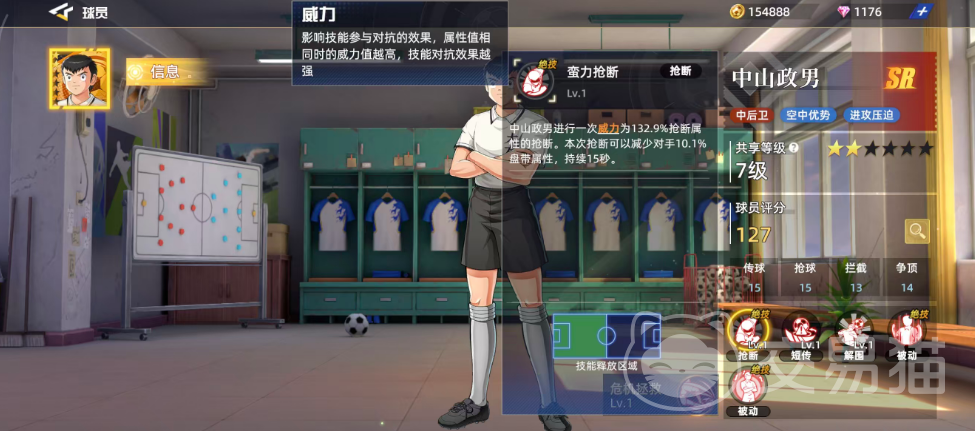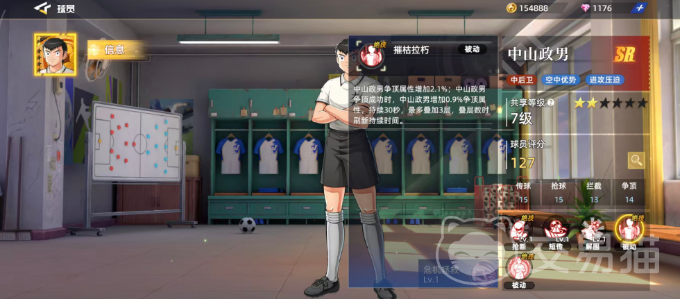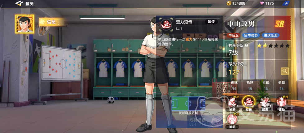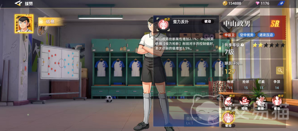 中山政男在游戏中为SR品质球员,司职中后卫,具备出色的空中对抗能力和防守压迫性。他的球员总评达到127分,在多个关键属性上表现均衡:传球与抢球均为15分,拦截为13分,争顶为14分,整体数值分布合理,没有明显短板。尤其值得注意的是,他在预判方面的评分高达17分,是所有基础能力中最为突出的一项。这一优势使得他在自动对战模式下能够更有效地完成防守判断,提升队伍整体防守稳定性,因此非常适合作为新手阵容中的后防人选。