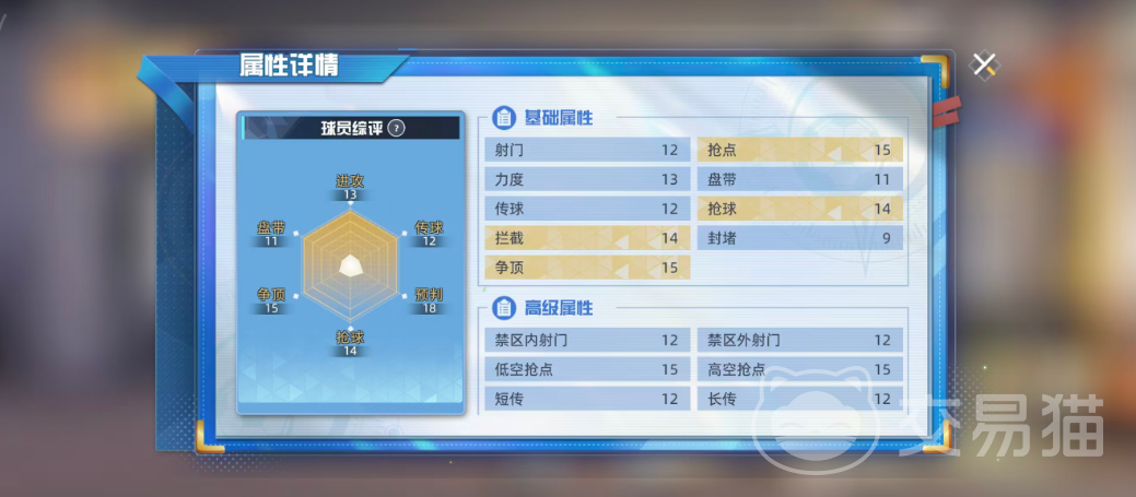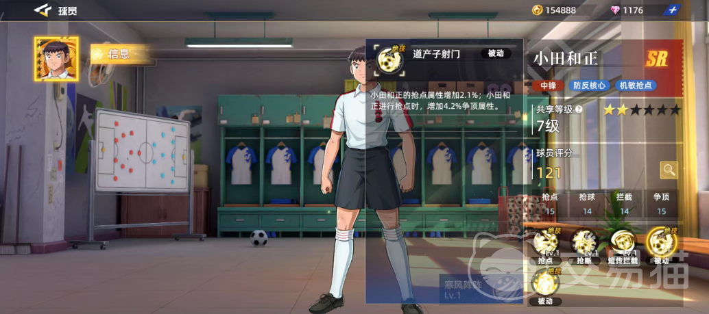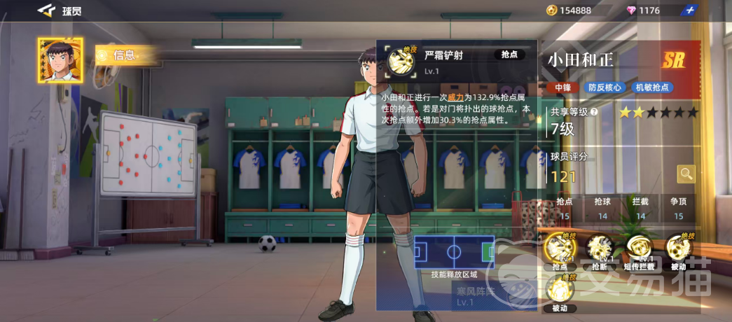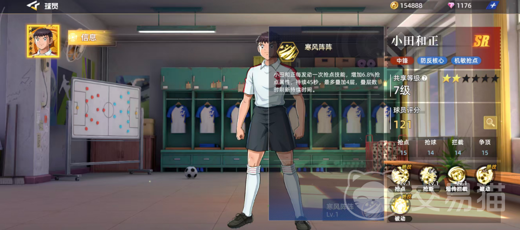 小田和正是游戏前期即可获取的SR级中锋,其角色定位清晰,擅长在防守反击体系中发挥作用。整体表现灵活且具备一定战术价值,后期还可凭借技能机制成为抢点进攻的关键人物。基础评分为121,在同品质球员中处于中等偏上水平。具体能力方面,抢点15、抢球14、拦截14、争顶15,显示出他在多个关键属性上的均衡发展。六维图中抢球数值略低,仅为14,因此在实战中应尽量规避这一短板,但其余能力已足以支撑他在SR层级中的竞争力。