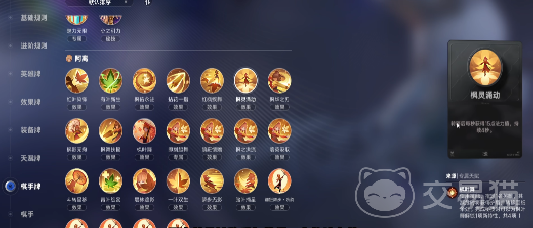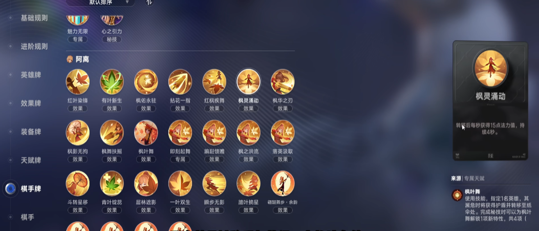 定位为战斗型棋手,其被动允许指定一名英雄,在其生命值濒临归零时转移至纸伞并附加护盾。完成秘技条件后,可为该被动解锁一项强化特性。具体解锁节点为:被指定英雄分别击败第3、7/11、15名敌方单位时,逐步激活不同强化效果。例如“有叶新生”可在转移后恢复20%最大生命值,或使护盾持续时间无限延长。六星天赋则提供三个“枫叶舞”选项供选择,进一步定制化辅助路径。