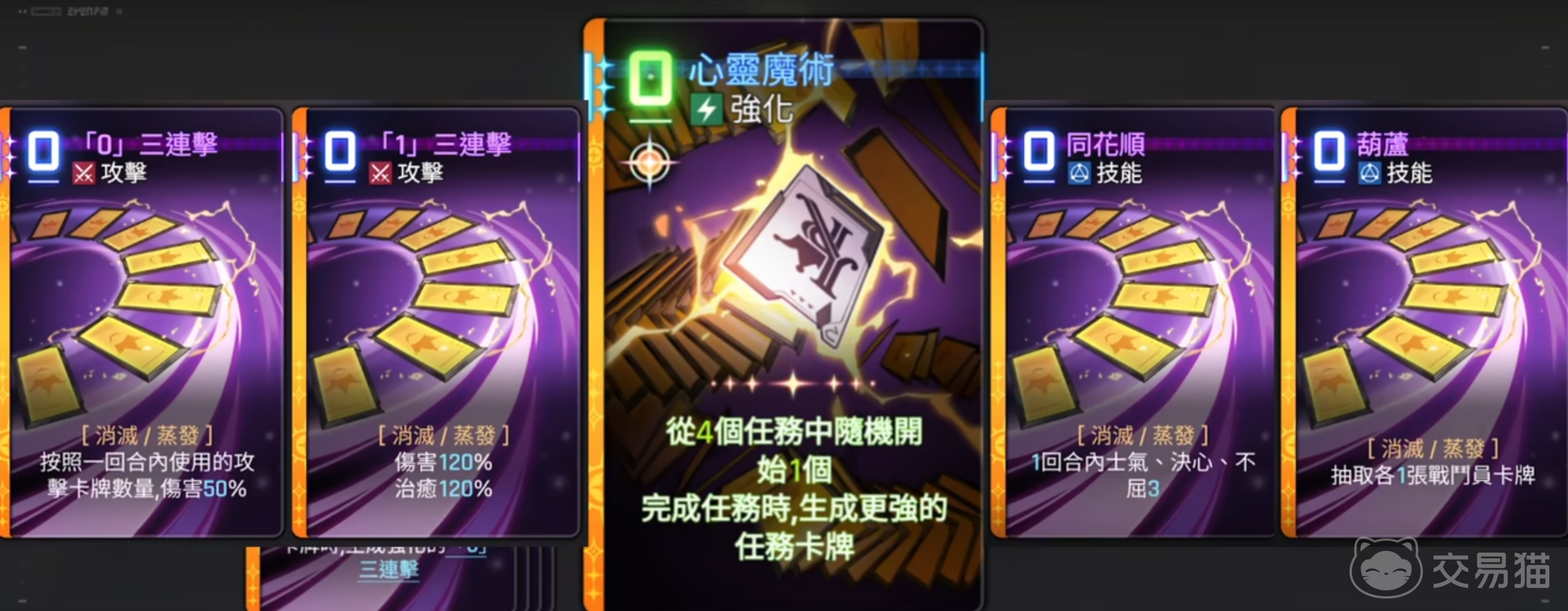 凯西乌斯的基础卡组由四张卡构成:一费攻击、二费攻击、一费治疗以及一张关键功能卡——心灵魔术(一费强化)。这张独特卡牌能够从四个随机任务中启动其一,每完成一项任务即可获得对应的任务奖励卡。具体任务包括:【任务0:三连击】,当玩家在一回合内累计使用三张费用为0的卡牌时触发,造成等同于攻击次数40%的伤害;【任务1:三连击】则需使用三张费用为1的卡牌激活,提供90%攻击力的伤害或治疗效果;【任务:同花顺】要求依次使用0费、1费、2费卡牌各一张,成功后可为全队提供士气、决心、不屈各2点增益;最后是【0任务:葫芦】,在使用不同战斗员卡牌后触发,直接抽牌2张。玩家可通过角色左上角的任务提示实时追踪进度,合理规划出牌顺序以最大化收益。其中,“同花顺”和“葫芦”因其显著的团队增益与手牌补充能力,成为最常选用的任务路线。