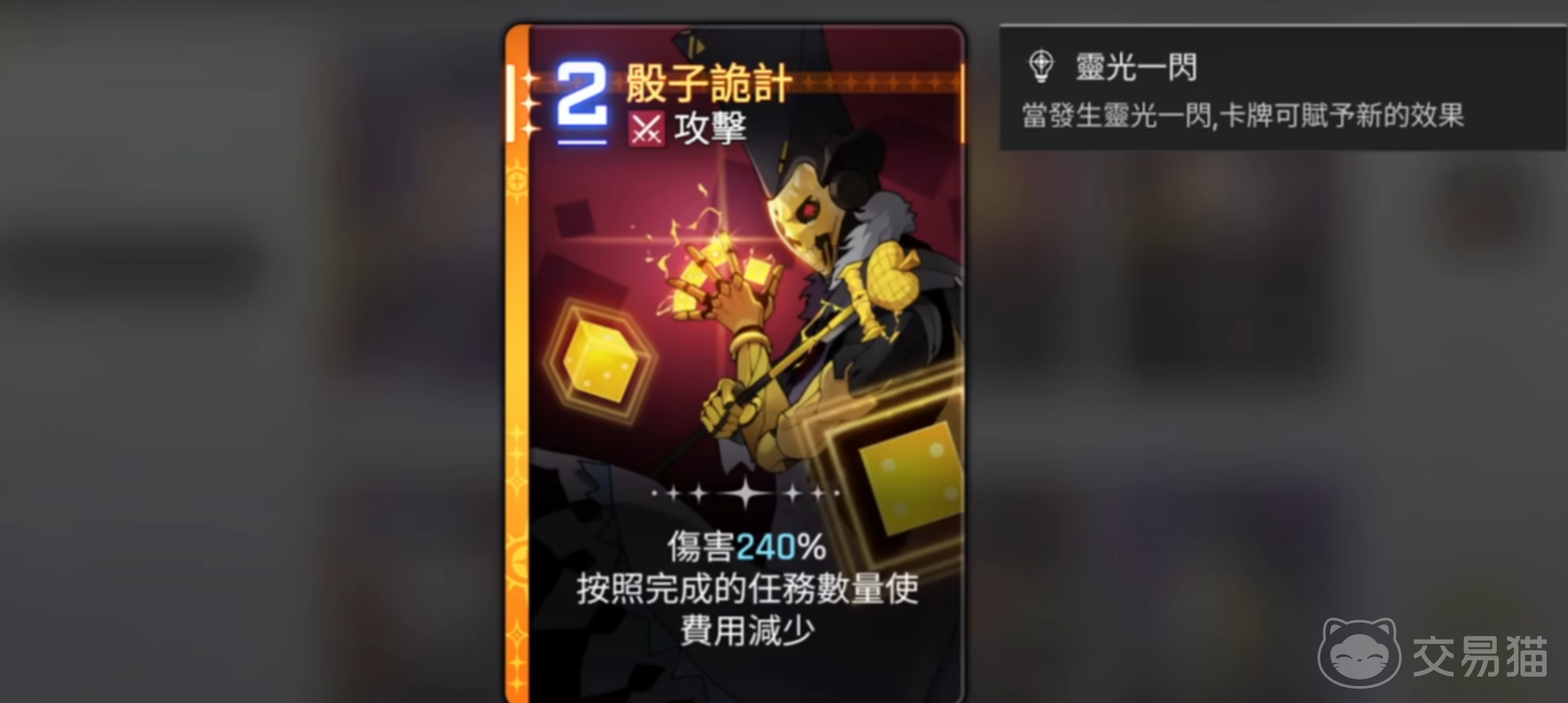 灵光一闪系列进一步拓展了凯西乌斯的战术灵活性。五张升级版本中,前两张均具备【开战】效果,可在首回合立即开启任务流程,提升节奏效率。第三张强化任务完成后的奖励,例如将“葫芦”任务的抽2调整为抽取各一张战斗员卡牌,增强功能性。第四张允许玩家主动选择任务类型,规避随机带来的不确定性。第五张则在任务完成后重新生成其他随机任务,在不利情况下提供补救机会。此外,恶魔骰子作为一费攻击卡,基础效果为160%单体伤害并抽1,其灵光一闪分支提供了多种变体:1级提升伤害至200%并生成任务卡;3级转为群体攻击,对所有敌人造成160%伤害,并根据目标数量抽牌;4级伤害高达240%,抽2但需弃2;5级则依据卡牌费用对全体敌人施加60%倍率伤害并抽1。这些设计充分体现了凯西乌斯出色的资源循环能力。