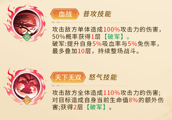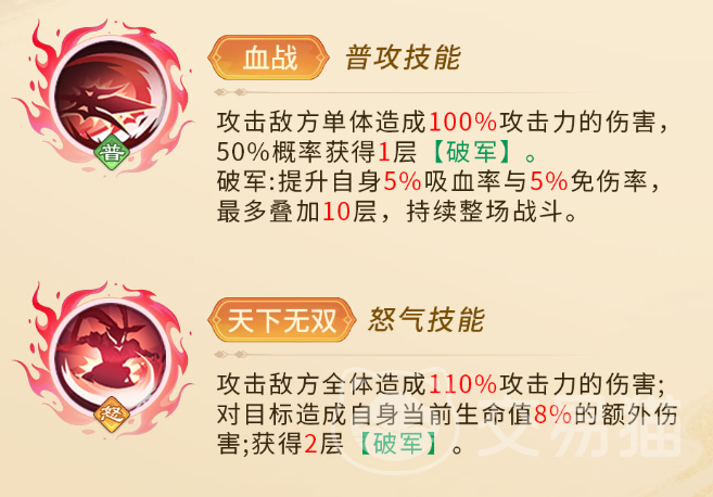 在三国历史中,唯有面对吕布时群起而攻之才被视为合理战术,足见其战斗力之恐怖。在《三国大冒险》中,吕布同样是当前版本最顶尖的输出型武将之一,具备全游戏最高的基础攻击属性。其普攻名为“血战”,对单个敌人造成100%攻击力的伤害,并有50%几率触发“破军”状态。该状态可使自身获得5%吸血与减伤效果,最多叠加10层,且持续整场战斗,极大地提升了生存与续航能力。