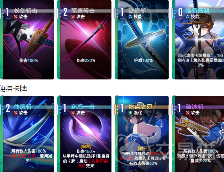 她的技能设计围绕“灵感触发”与“攻击联动”展开,核心技能“天际斩击”在释放时可对全体敌人造成300%的基础伤害,并将所有攻击类卡牌置顶,同时附加50%的伤害加成。若配合自我意识强化效果,该技能还能额外获得80%的伤害提升,显著增强爆发能力。基础输出依赖“长剑斩击”,稳定提供100%伤害;而“高速斩击”则拥有高达220%的伤害倍率,是主要的高伤手段之一。