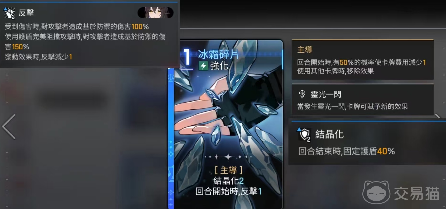 她的第一张专属卡“冰霜碎片”是一张一费强化卡,附带结晶化2效果,在回合开始时可触发反击1。其中,“结晶化”意味着在回合结束时根据层数生成固定数值的护盾。第二张专属卡“冰河铁拳”可造成基于防御值150%的伤害,并获得相当于本次伤害量50%的固定护盾。需注意的是,若部分伤害被敌方护盾吸收,则该部分不计入护盾返还计算。