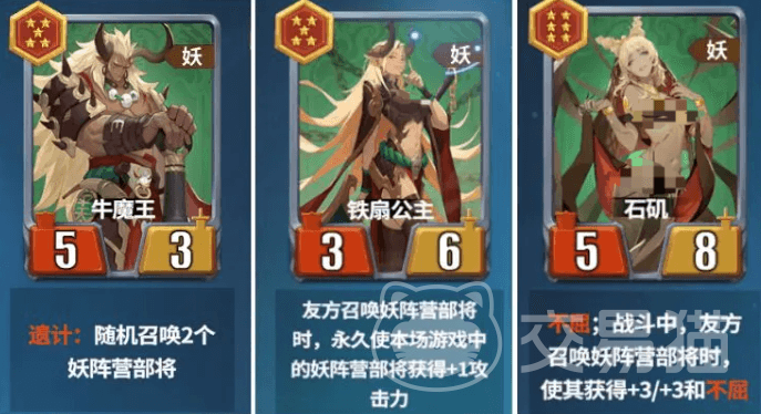 该体系的核心依赖于三位关键角色:石矶、铁扇公主和牛魔王。其中,石矶能够为所有召唤单位附加不屈状态,显著增强其战场存活能力;铁扇公主则具备独特的增益机制——每当友方召唤出妖阵营部将时,全场所有妖阵营部将永久获得+1攻击力,这一效果可叠加,是提升整体输出的关键所在。