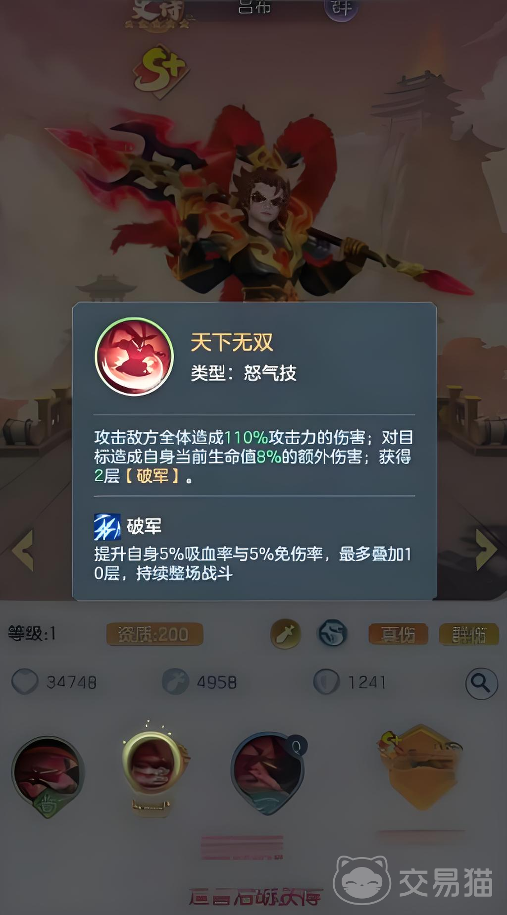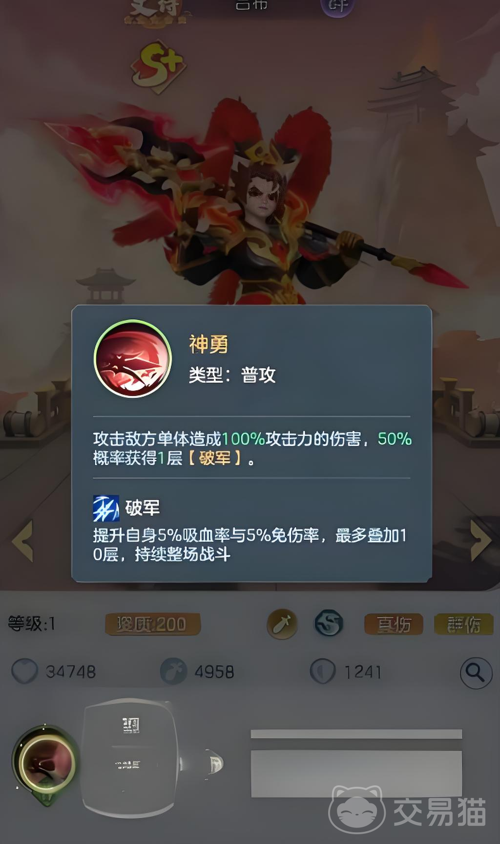 他的普通攻击“神勇”可对单个敌人造成等同于自身攻击力100%的伤害,并有50%几率叠加一层“破军”状态。每层破军可提升5%吸血与5%免伤,最多叠加至10层,这意味着吕布在持续作战中能快速进入高生存、高回复的强势区间。