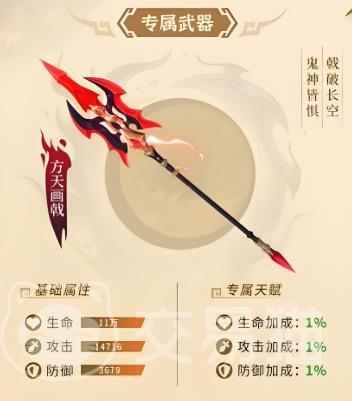 此外,吕布拥有专属武器——方天画戟,该装备为其提供高达1万点攻击力与11万点生命值加成。同时,在三项关键属性成长率上分别提升1%,包括生命、攻击与防御,进一步放大其综合战力。