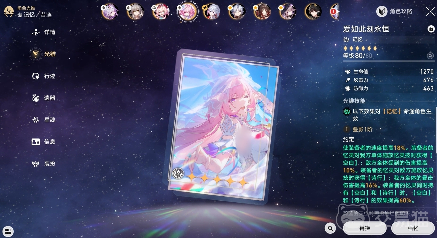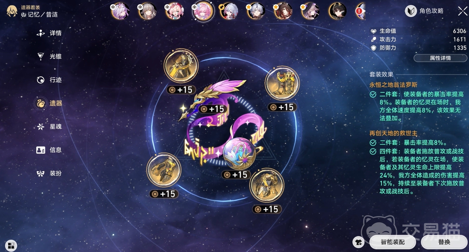 从配队角度来看,昔涟最契合的搭档包括遐蝶、长夜月以及风瑾,这些角色能最大化她的协同效率。其次,白厄、星期日和丹恒·饮月也是不错的搭配人选。若有二命加持,昔涟在非黄金裔队伍中也能快速攒满能量开启终结技,因此具备广泛的队伍适配性,能够胜任多数主流阵容中的辅助位置。装备配置方面,优先推荐使用其专属光锥,若暂未获取,可选用模拟宇宙中记忆命途的通用光锥替代。遗器推荐救世主四件套搭配翁法罗斯两件套,主属性选择爆伤衣、速度鞋、生命或冰伤球、生命百分比链,副词条优先堆叠速度,目标将速度提升至180,以确保被动完全生效,其次补充生命百分比与爆伤属性。