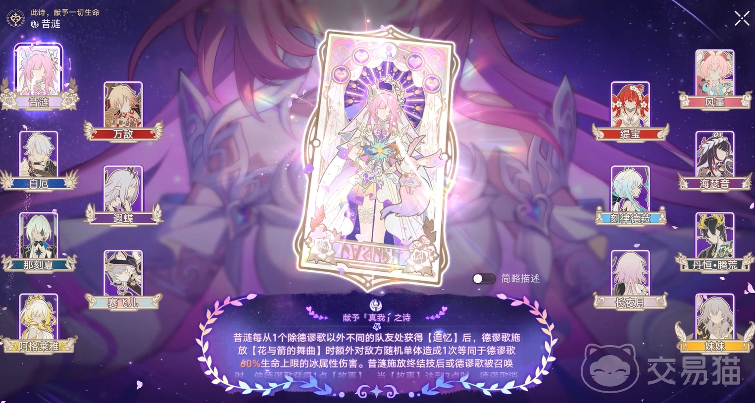 昔涟的核心机制围绕“追忆充能”展开。她的战技不仅能为全队提供真实伤害加成,还能为自己积攒3点追忆值。此外,每当队友或其忆灵行动时,也会为昔涟额外提供1点充能。当累计达到24点后,即可释放终结技,进入名为“往昔的涟漪”的特殊状态。在此状态下,昔涟将以忆灵形态出场,并立即激活所有队友的大招,随后可选择对敌方全体发动一次群体攻击,或为指定角色施加强化效果,二者择其一。