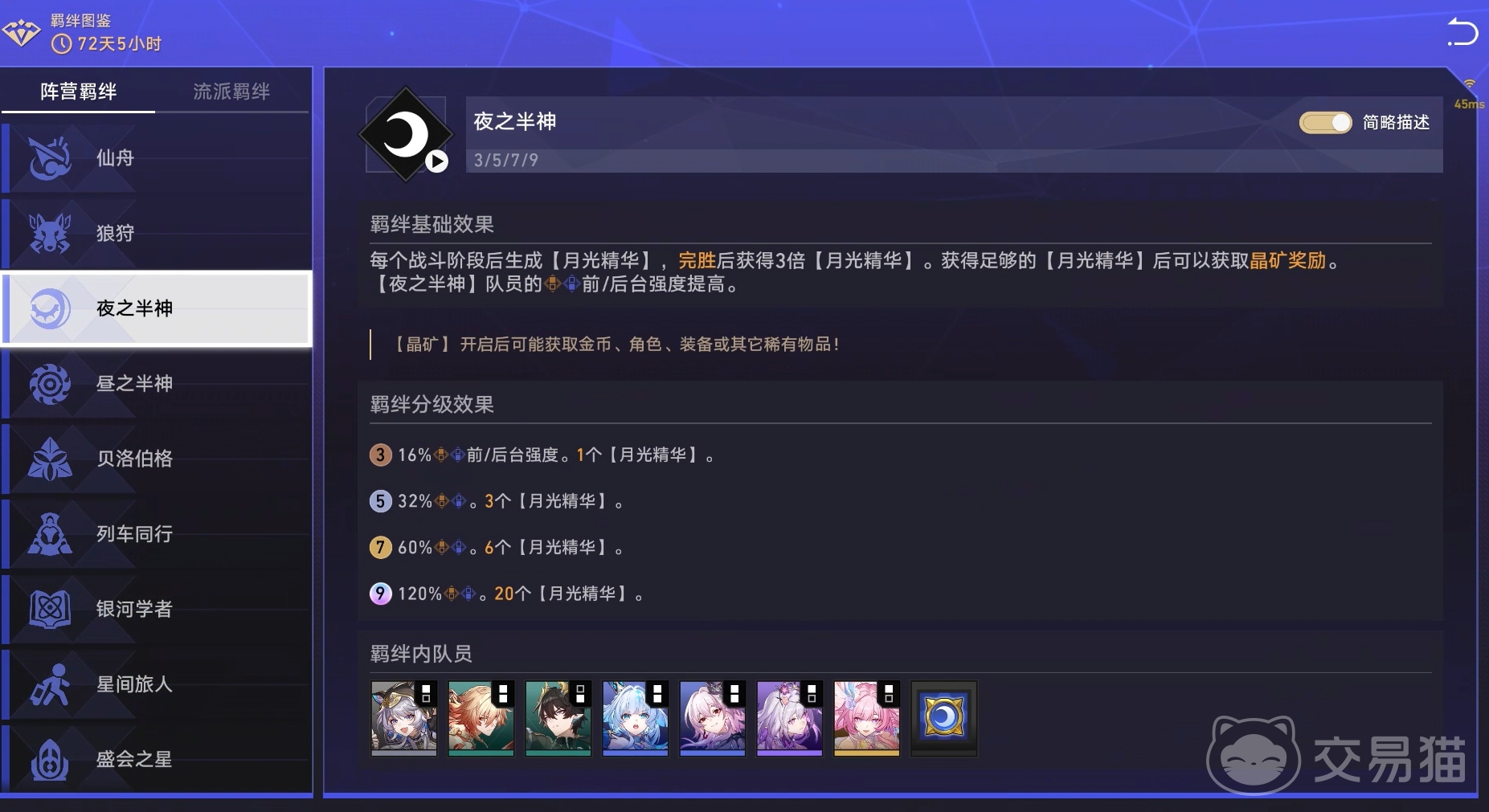 夜之半神羁绊具备资源积累功能,类似“挖矿”机制。每场胜利后可根据当前羁绊层数获取月光精华,积满后可兑换丰富奖励,包括货币、装备及角色资源,长期收益可观。由于多个具备夜之半神标签的角色同时拥有燃血属性,因此可与燃血羁绊形成联动,例如7夜之半神搭配4燃血,进一步增强阵容稳定性与输出潜力。
