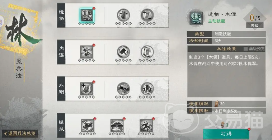 对于资源有限的平民玩家而言,优先推荐选择“造物”这一兵法。该兵法在非战斗状态下可持续积累特殊道具,在守城战中还能召唤两组木偶假人参与防守。这些假人具备吸引敌方火力的能力,并能有效干扰敌军输出节奏,从而提升整体防线的稳定性。由于其实用性强且适用场景广泛,成为前期性价比极高的核心兵法之一。