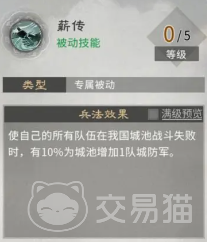 此外,“薪传”是一项具有逆境应对功能的兵法,可在战斗失败后触发,自动生成一队城防军。这支临时部队虽不具备强反击能力,但足以延缓敌方推进速度,为主城重建防线争取宝贵时间。虽然该兵法在后期缺乏强势翻盘手段的情况下实用性较低,但在特定局势下仍可作为最后的防御保障手段进行尝试性配置。
