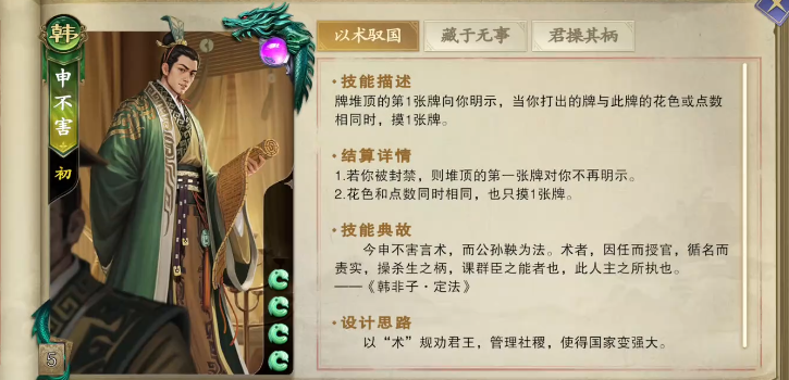 最后介绍的是控制系代表申不害。他的一技能具备预判功能,可以查看即将摸到的第一张牌,若打出的卡牌与其花色一致,则可额外摸一张牌,形成连贯出牌节奏,提高操作流畅度。二技能每局限用一次,当成为“杀”或战法类卡牌的目标时,可强制公开对方全部手牌信息,直至其回合结束。这一效果极大削弱了对手的信息优势,特别适用于组队模式中作为情报枢纽使用,帮助队伍制定针对性策略。
