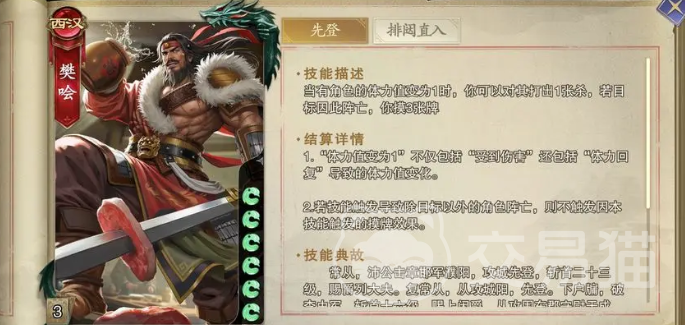 第二位推荐的是樊哙,他在信息掌控与爆发收割方面具有显著优势。技能一允许他在回合开始时查看攻击范围内所有角色的手牌内容,并强制其只能使用其中一张。当受到一点伤害后,若其体力值降至1点,即可立即打出一张“杀”。此效果特别适用于斩杀残血敌人,一旦成功击杀目标,还能额外摸取三张牌,形成滚雪球式的压制力,适合在中后期主导战局走向。