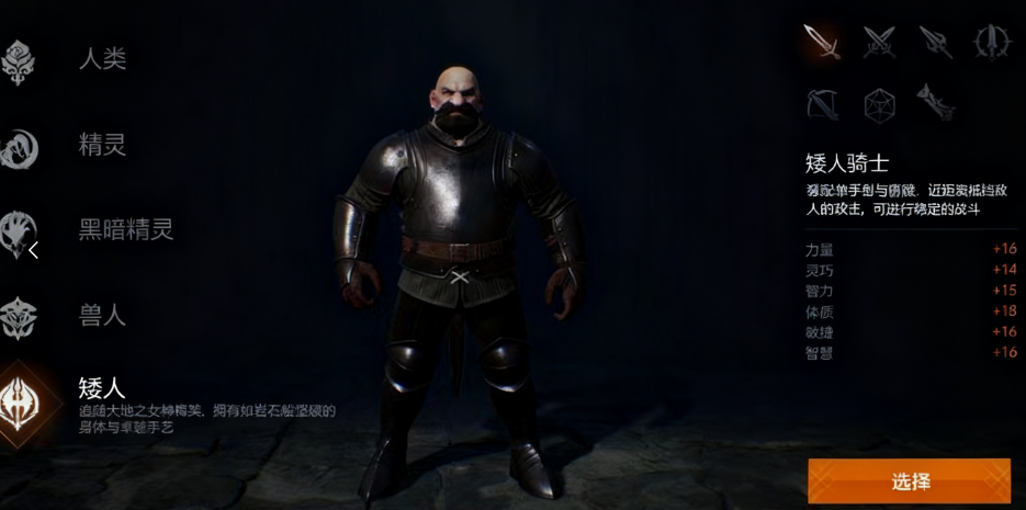 目前游戏开放了五大基础种族职业体系,分别为人类、精灵、暗黑精灵、兽人以及矮人。若想成为一名合格的矮人骑士,首先需选择矮人种族并完成对应职业转职。该职业以单手剑与盾牌为主要武器配置,擅长近身格斗,在前线承担防御与控场任务,操作逻辑清晰,适合新手逐步掌握团队协作节奏。