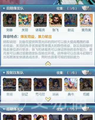 当周瑜与陆逊两位核心角色到位后,整个队伍的输出框架已基本确立。其余位置可搭配其他具备施加灼烧状态能力的角色,这些辅助型武将大多可通过常规抽卡资源逐步获取,不会对零氪玩家造成过大压力。