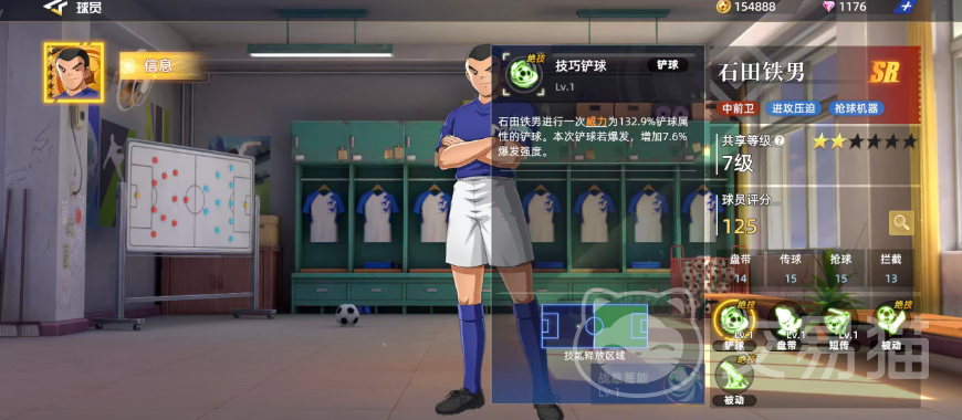 在技能配置上,石田铁男拥有“铲球”这一高效防守技,释放时可触发约132%基础值的铲球效果。若在此过程中激活爆发状态,还能额外提升7.6%的强度。该技能在右半场覆盖范围较广,不仅能有效切断对手进攻路线,成功抢断后还能迅速转入反击,为队伍创造得分良机。