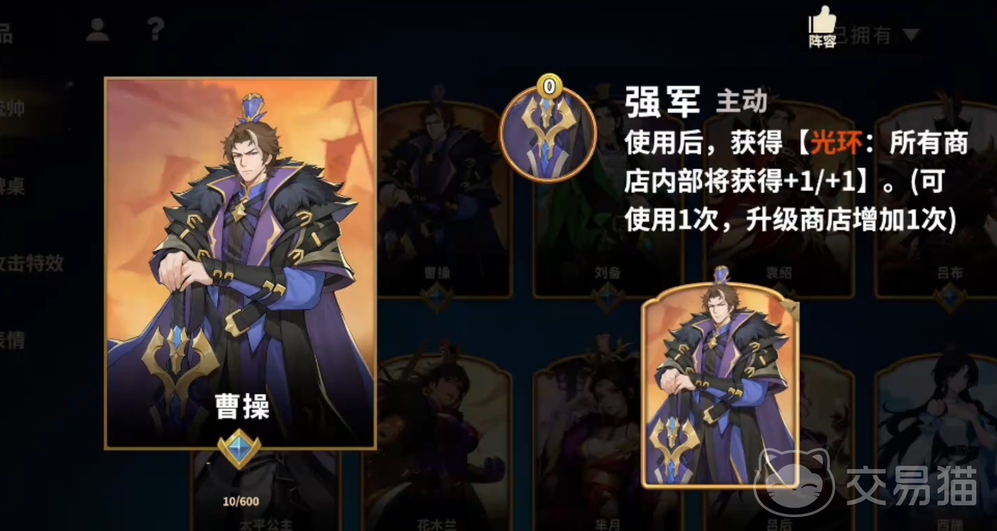 曹操的光环机制与嬴政相似,初始也能为部将带来攻击+1和血量+1的加成。区别在于,曹操需通过主动技能对商店内的部将施加增益,且初始仅能使用一次,每次升级商店后可用次数增加一次。已购买的部将保留加成,但刷新商店后新出现的单位不再享受此效果,因此操作时机尤为关键。