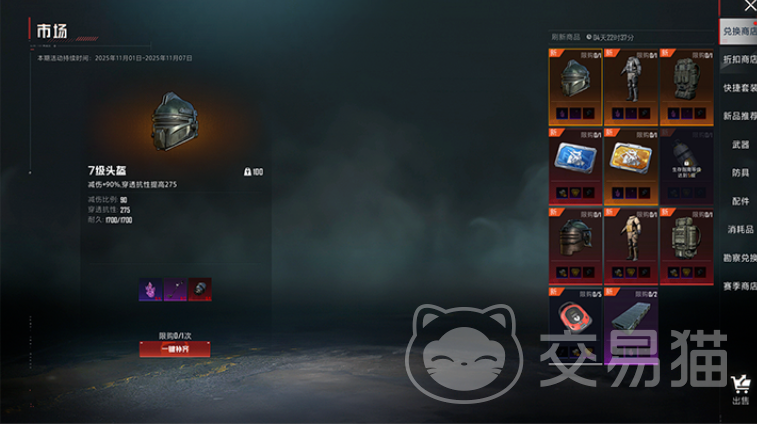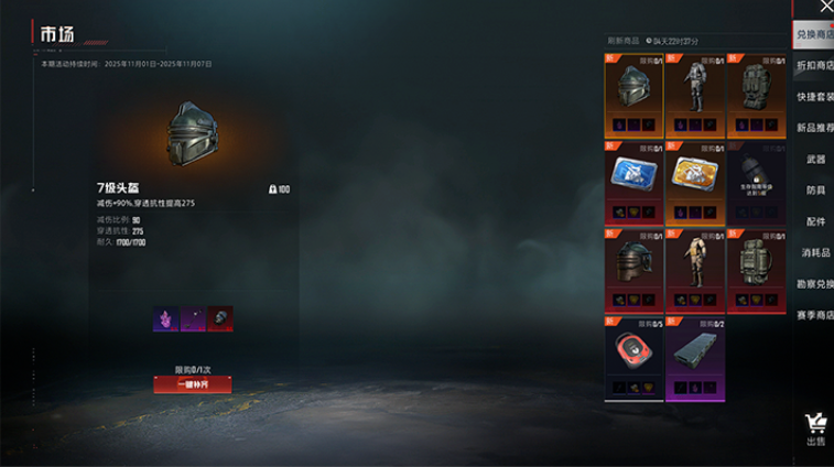 伴随交易行一同推出的还有限时兑换商店,以赛季活动形式开放。该商店内的商品会定期刷新,并设有购买次数限制。其中包含能源电池、7级防具等稀有高级物资,玩家还可使用指定变卖物兑换特定道具,进一步丰富获取途径。