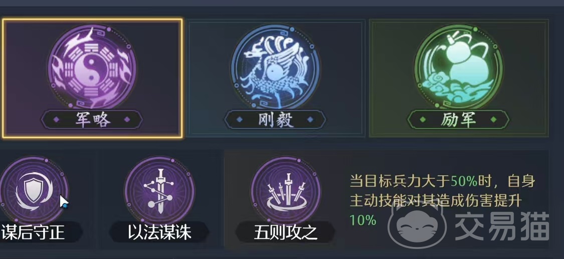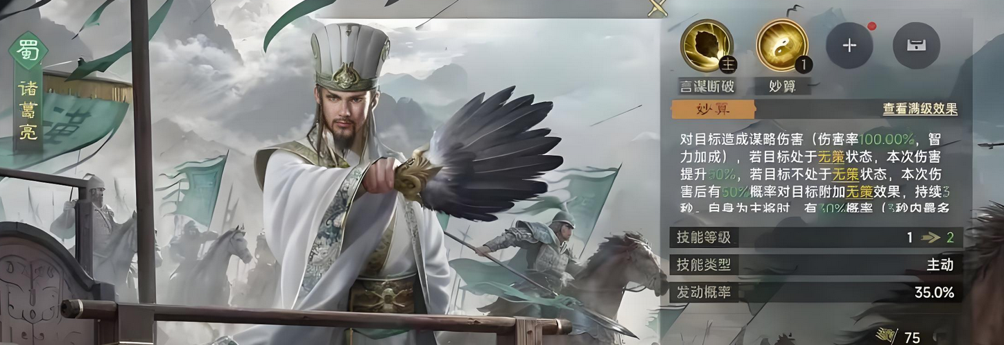 在兵法派系上,诸葛亮首选军略路线,因其技能机制围绕“无策”状态展开,具备强力的控制与谋略输出能力。具体搭配需根据阵容调整。若采用刘备、关羽与诸葛亮的经典蜀国铁三角,建议主修军略中的【五则攻之】,以增强主动技能伤害。辅助兵法可选用【雷霆】提升谋略伤害倍率,搭配【集气】加快技能释放频率,再辅以【善谋】进一步提高智力属性,从而全面提升输出能力。