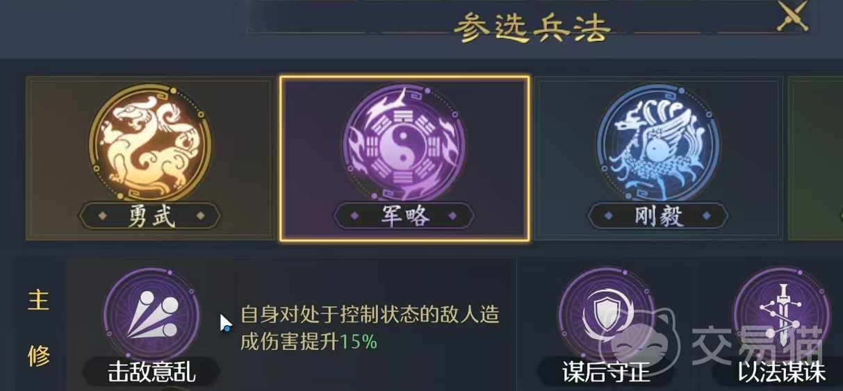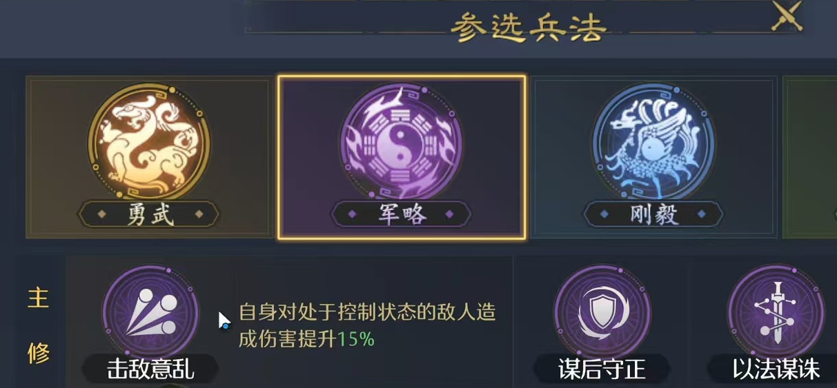 若构建纯谋略阵容,如诸葛亮、庞统与法正的组合,则推荐主修军略系中的【击敌意乱】,该兵法契合“无策”压制的核心战术。辅助兵法可选【善谋】强化智力基础,配合【集智】与【集气】加速技能循环,协同队友形成连续控制链,实现高效控场与持续输出。另一种热门搭配为诸葛亮、黄月英与法正的谋控体系,主打快速施加“无策”状态。此时诸葛亮仍主修【击敌意志乱】,辅以【集智】【善谋】等增益类兵法,借助黄月英与法正的联动机制,扩大“无策”覆盖率,彻底压制依赖主动技能的敌方阵容。