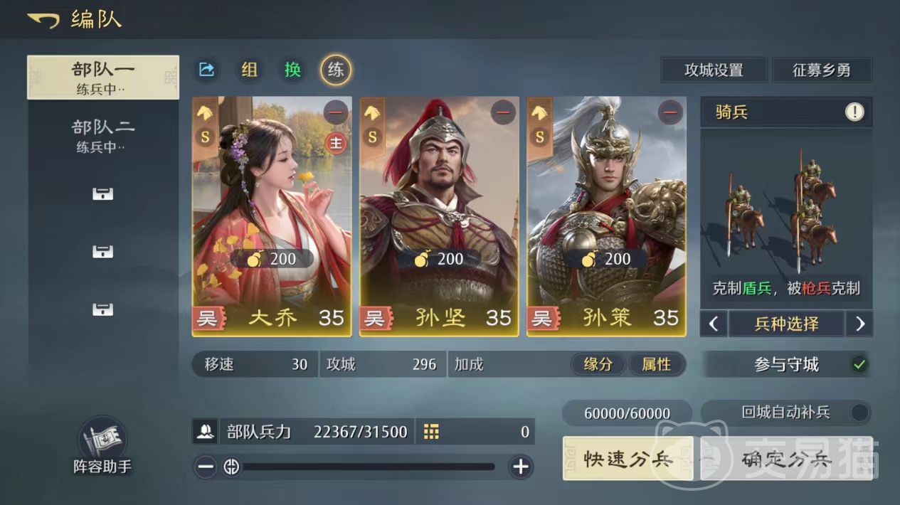 所谓首充队,是指通过参与游戏初期的首充活动即可获取核心武将,并结合登录奖励快速组建的一支高性价比队伍。具体而言,完成首充任务可获得大乔,而首日达成指定活动目标后,还能免费领取孙策与孙坚两位橙将。三位均来自东吴阵营,且能激活“江东霸主”这一强力阵营羁绊,进一步提升整体战力表现。更重要的是,三者在兵种适配度上均为骑兵S级,极大提升了部队在各类地形和对战场景中的适应能力,确保输出与生存达到理想平衡。