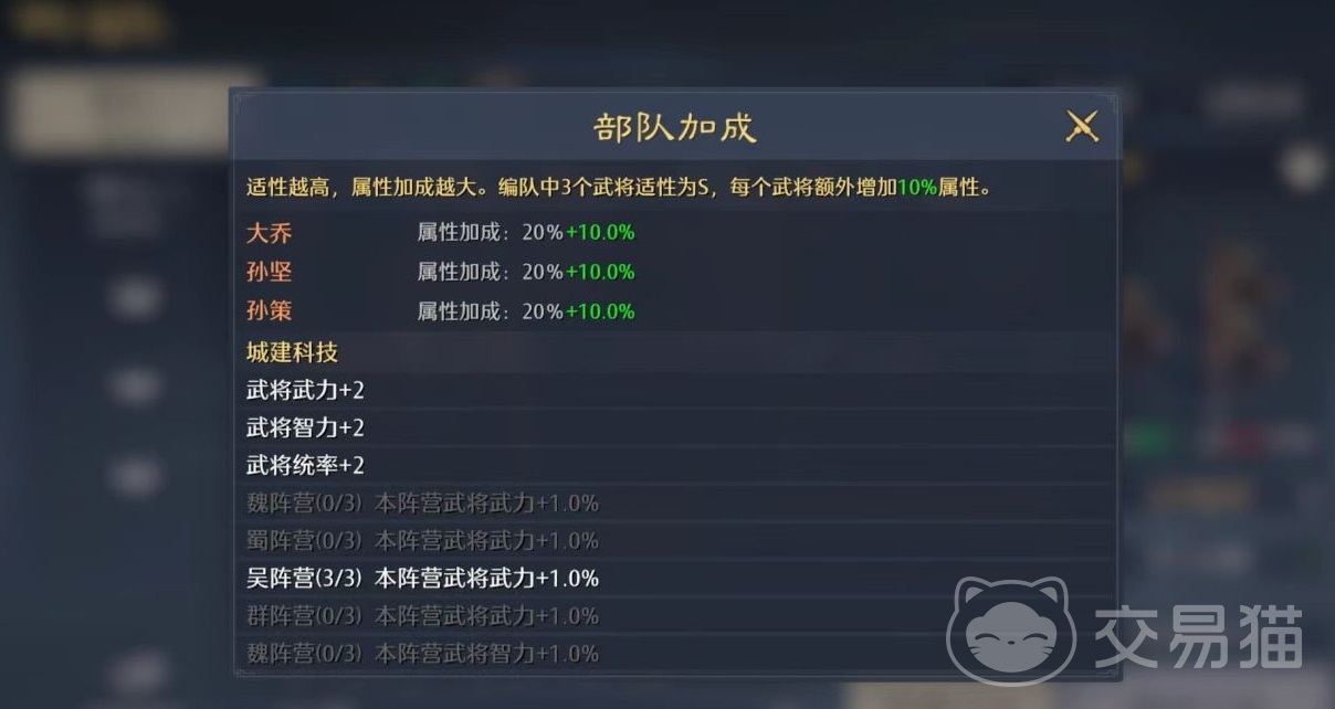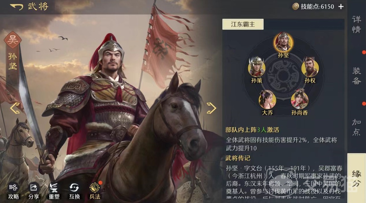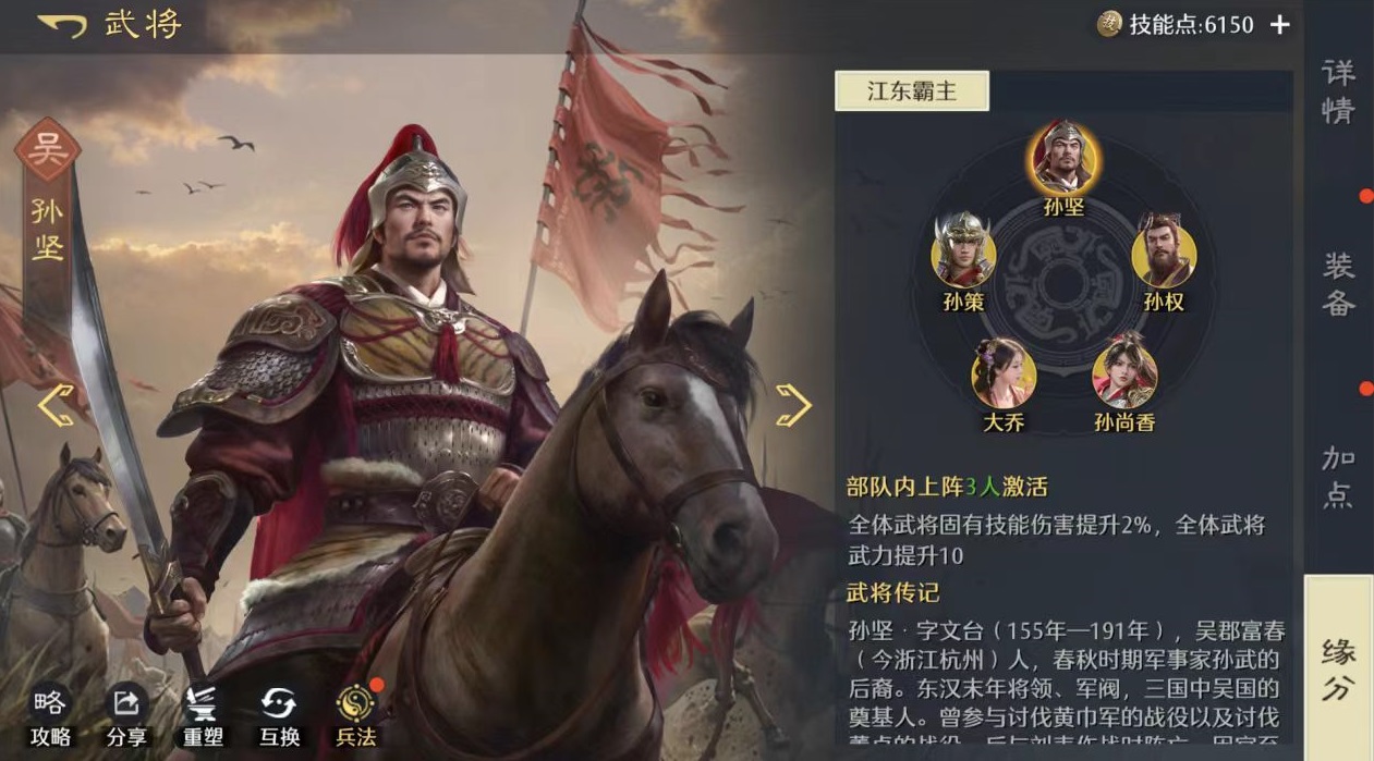 从技能协同角度来看,这套阵容具备极强的功能互补性。大乔拥有出色的治疗能力,其技能不仅能提供持续回复效果,还能为男性武将附加额外伤害加成,完美契合孙策与孙坚的输出定位。孙坚则以控制见长,释放技能时可施加威压与震慑状态,有效限制敌方行动并降低我方所受伤害。当孙策发动攻击且目标处于威压状态下时,可触发倒戈与吸血效果,实现伤害转化与续航补足。三者技能环环相扣,形成“回血支撑—控制压制—爆发输出”的完整作战循环,在前期推图与资源点争夺中展现出极强稳定性。