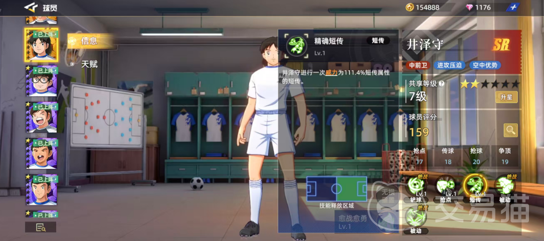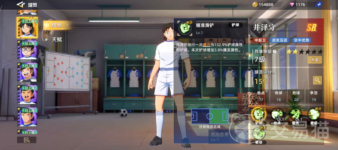 井泽守的整体评分为159,在同级别SR球员中属于较高水准。他在多个基础属性上展现出均衡的发展趋势,其中尤为突出的是预判能力,达到22点,这使得他在中场区域具备良好的局势判断力。此外,抢球20、争顶19、传球18和抢点17等数值也表明他在防守衔接与空中对抗方面具有明显优势。特别是争顶能力,使他在面对高空球时能有效压制对手,这一特点在当前多数中前卫球员中较为罕见。