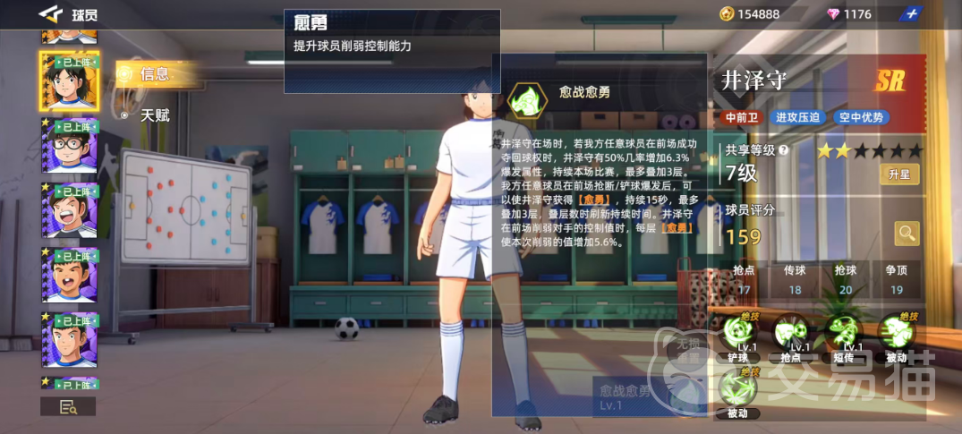连环爆发是一项高效的被动强化技能,初始提升2.1%铲球属性,每次执行铲球动作后还可叠加1%铲球强度,最长可持续50秒。而“愈战愈勇”则赋予全队持续性增益:每当己方球员在前场成功夺回球权时,井泽守有50%概率获得6.3%爆发属性提升,此效果整场有效,最多叠加三层。同时,每层将激活一层【愈勇】状态,单层持续15秒,最多叠加至三层,期间能显著削弱对方控球稳定性,尤其适用于高压逼抢战术体系。