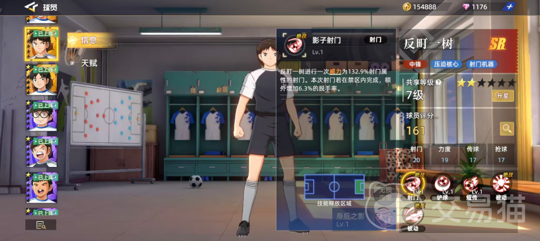 在技能体系方面,反町一树的核心输出手段是“影子射门”,这一技能可在发动时释放威力达132.9%射门属性的强力射门。相较于其他同品质角色,该技能拥有更高的伤害系数。此外,若该射门动作在禁区内完成,还将额外提升6.3%的门将脱手率,进一步提高进球概率,因此合理选择释放时机至关重要。