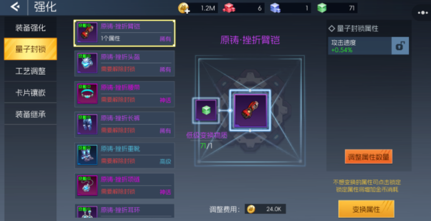 为了避免强化失败带来的等级回落,玩家可以使用强化保护剂进行防护。该道具不仅能防止降级,还能累积保护进度,当进度达到100%时,下一次强化必定成功。此外,量子封锁系统也为角色提供了额外的成长空间。通过解锁粒子,玩家可随机获得附加属性,进一步增强战斗力。若使用高级解封粒子,则有机会一次性获取三个不同属性效果。
