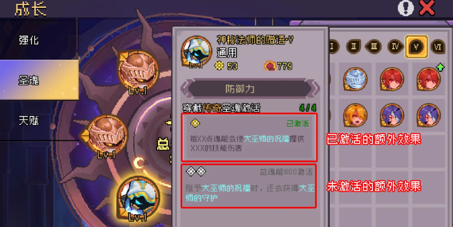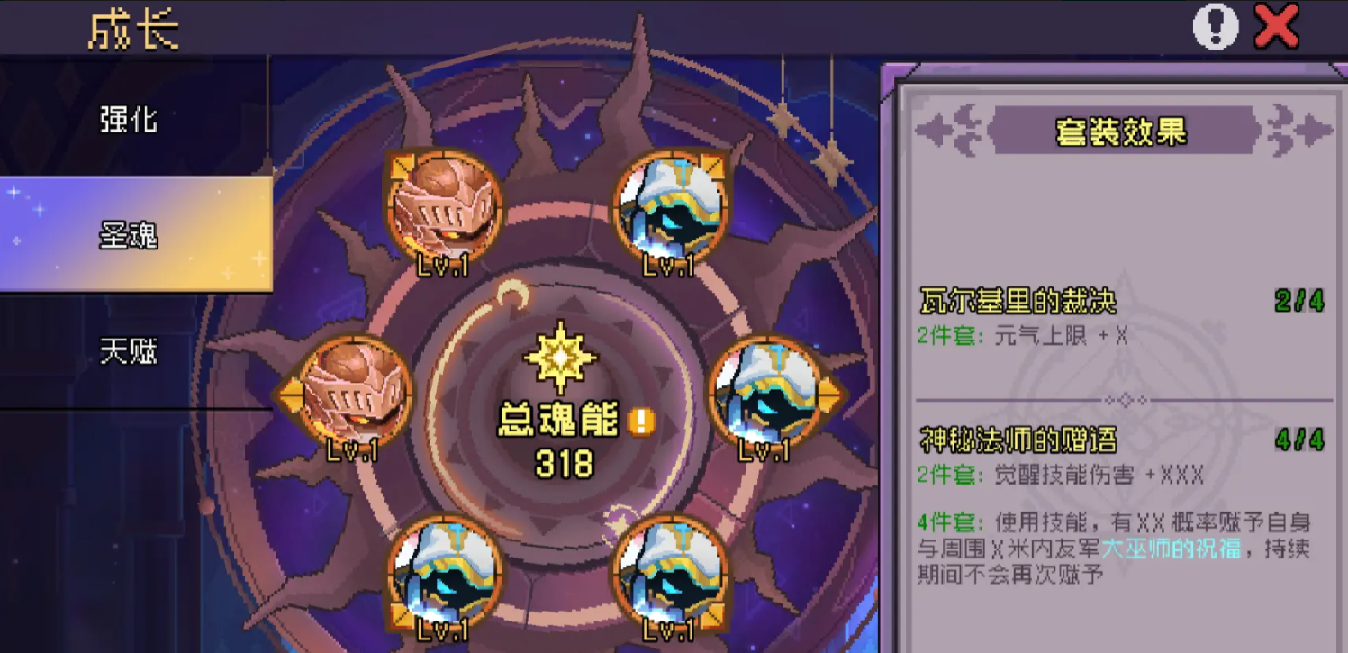 每个圣魂都附带一定数值的魂能,装配后会累计至总魂能值。除了圣魂本身提供的魂能外,角色所穿戴装备的锻造等级与品质也会影响最终的总魂能表现。相同名称的圣魂属于同一套装系列,当装配2件或4件同系列时,即可激活对应的套装效果。例如,“神秘法师的赠语”两件套可提升觉醒技能伤害,四件套则在释放技能时有一定几率为自身及队友附加祝福状态。