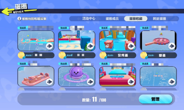 系统还内置了便捷的地图分享机制,在收藏界面最多可向圈内成员同步5张精选地图,点击即可直接游玩。除了本圈资源外,还能查看周边蛋圈及其他玩家公开的地图收藏,及时获取热门玩法资讯,避免错过流行内容。