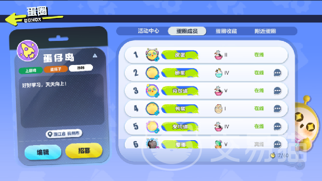 在蛋圈成员页面中,可以查看每位好友的状态信息,包括是否在线等。同时,圈主还能自定义设置蛋圈名称、添加兴趣标签以及编辑个性宣言,帮助吸引理念相近的玩家加入,逐步扩大社群规模,打造专属的游戏小天地。
