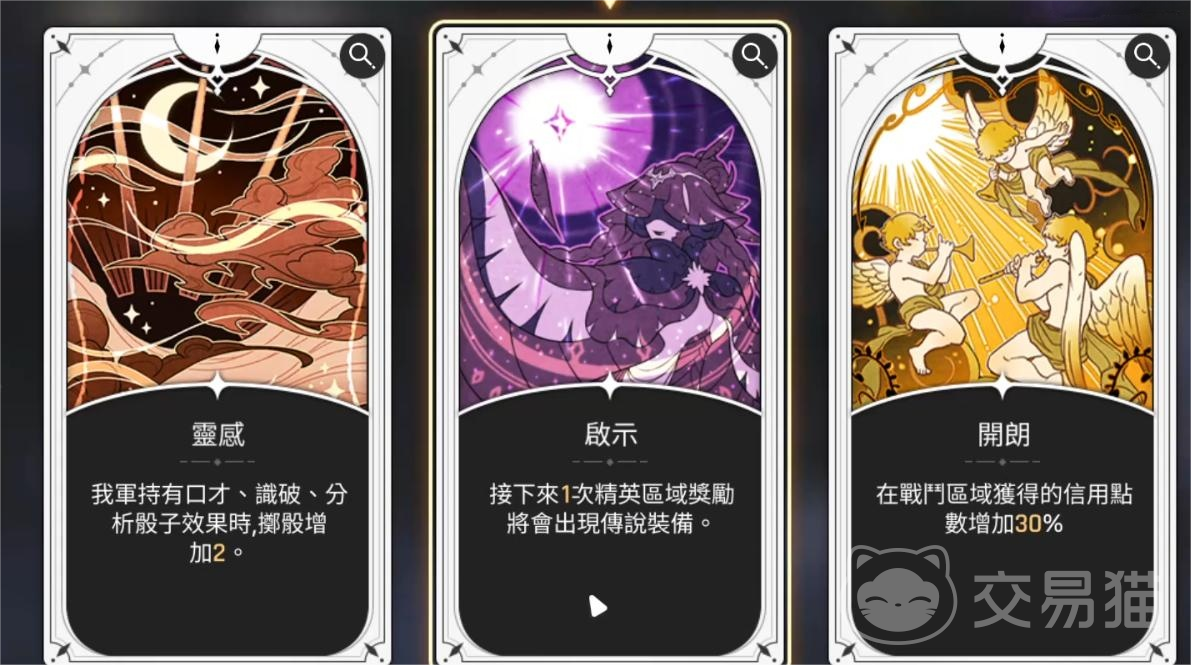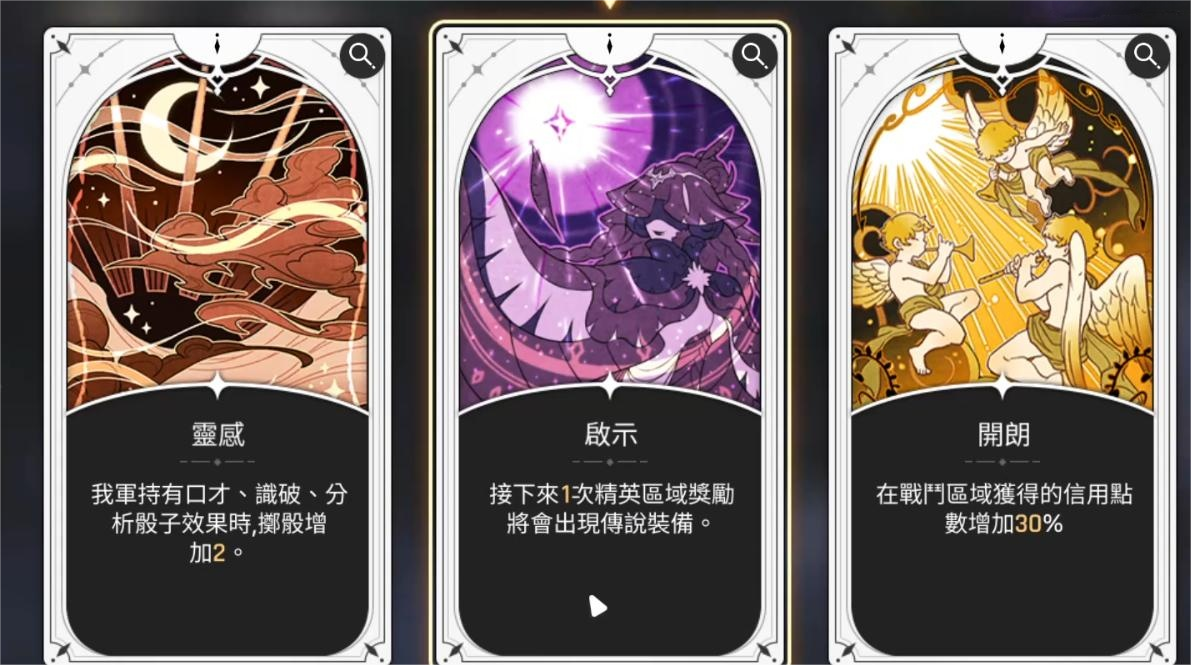 玩家可选择以下三种增益效果之一以增强作战能力:灵感——提升我方口才、识破及分析类骰子效果2点;启示——下一次精英区域奖励中必定出现传说级装备;开朗——在战斗区域获得的信用点提高30%。这三项加成均能显著降低挑战难度,帮助玩家更高效地积累资源。
