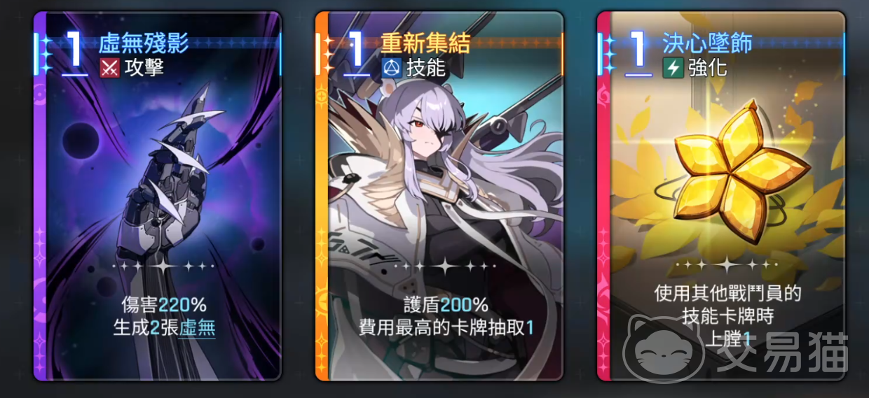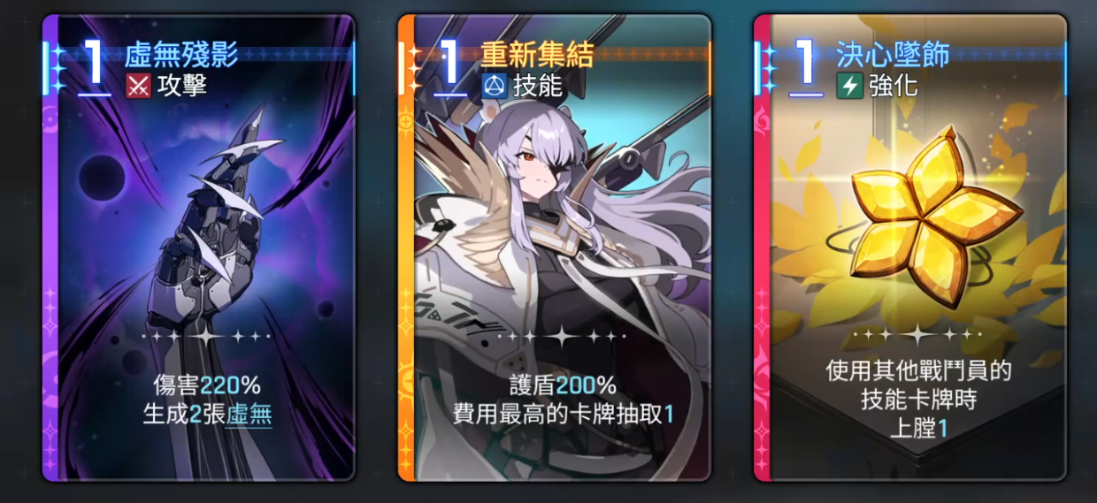 装备方面,虚无残影(紫色品质)提供220%的攻击力加成,并额外生成两张虚无效果卡牌;技能“重新集结”可在消耗最高费用的护盾后抽取一张卡牌,便于快速获取关键组件,提高连招触发几率;决心坠饰则允许在使用其他战斗员技能卡时完成上膛动作,有效加快战斗节奏与输出效率。