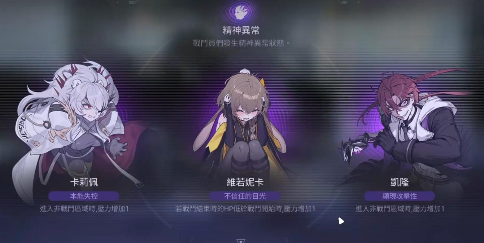 在蓝壶星球上可能出现三种异常状态:其一是卡莉佩德本能失控,当进入非战斗区域时,角色压力值会上升1点;其二是纬若妮卡因不信任目光而产生负面反应,若战斗结束时的生命值低于战斗开始时,则压力增加1;其三是凯隆表现出攻击倾向,进入非战斗区同样引发压力+1的效果。每种异常都需要针对性策略应对,合理规划行动路线和战斗节奏至关重要。