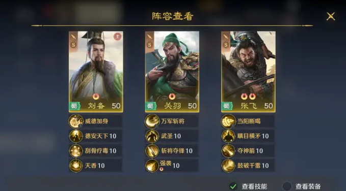 关羽在此阵容中主打控制,依靠自身技能施加重伤与束手效果,有效限制敌方核心输出单位。推荐配置“斩将夺锋”与“强袭”,前者叠加重伤,后者提供高额爆发。配合其附加的虚弱状态,能与刘备的被动形成联动,进一步提升团队输出效率。张飞则作为主力输出点,建议装配“夺神箭”与“鼓破千雷”等高倍率技能;若暂时无法获取,也可选用“猛击”或“重创”等输出型战法进行替代。