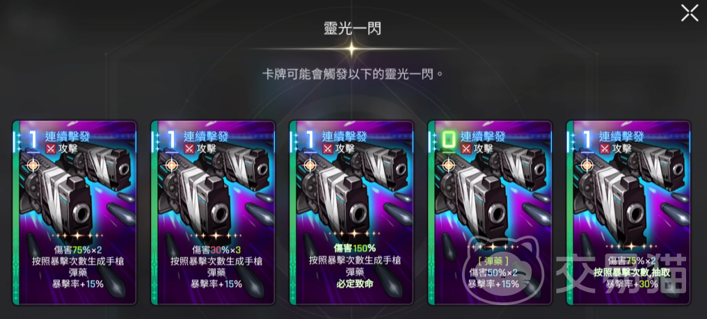 路克的第一张攻击卡可触发两次50%伤害的一费攻击,并依据暴击次数生成对应数量的手枪弹药,同时提升15%暴击率。这意味着只要将角色面板暴击堆至85%,即可实现必爆输出。其所附带的四种手枪弹药均为零消耗且具备蒸发、消灭弹药等词条,与卢卡斯的发射器弹药不同的是,这四类弹药均为单体攻击形式,虽伤害偏低但胜在无需费用释放,整体平衡合理。进入灵光一闪状态后,第二张卡虽降低单次伤害,却增加了攻击频率;中间版本仅保留一次攻击,但确保必定暴击;第四张新增弹药获取途径,却失去生成手枪弹药的能力。综合来看,第二张卡在实战中的适配性更优。
