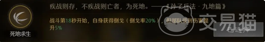 黄忠的兵法推荐首选“死地求生”,当战斗进行至18秒且角色仍存活时,将获得20%倒戈概率,同时我方部队受到伤害提升5%。该效果存在风险与收益的平衡,需根据战场情况谨慎使用。若不选择此兵法,也可为其装配“奋鼓”,与关羽形成联动,进一步强化团队输出稳定性。