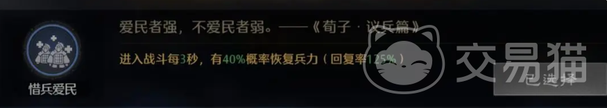 徐庶的兵法选择主要有两个方向:一是“惜兵爱民”,每3秒有40%概率触发一次兵力回复,回复量高达125%,极大增强了队伍的持久作战能力;二是“乐善”,可使其治疗效果提升10%。虽然数值不高,但在缺乏其他治疗手段的阵容中,这一增益对维持整体续航具有重要意义。