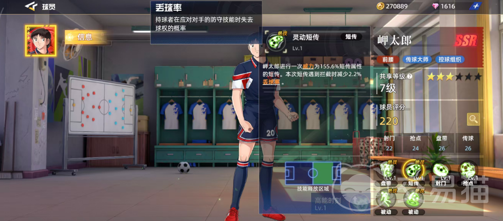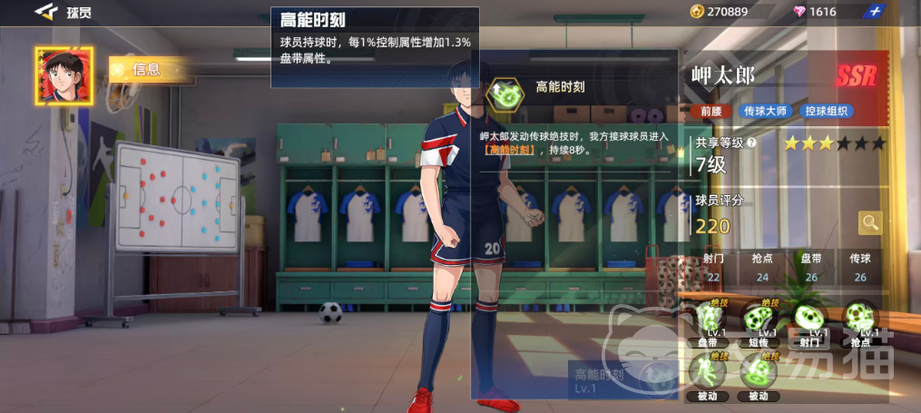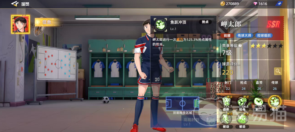 另一项进攻技能为“鱼跃冲顶”,属于抢点击球类绝技,同样具备125.3%的威力加成。虽然岬太郎并非专职空中对抗球员,但在右路临近球门区域发起头球攻门时,借助技能加持仍具备一定威胁性。被动技能“轻盈律动”可在盘带时提供3.5%的属性提升,并在接球瞬间根据短传属性额外获得1.8%的增益。当队伍整体攻势值高于90%时,该被动还可再次触发,追加3.5%的盘带属性提升,进一步增强控球流畅度。