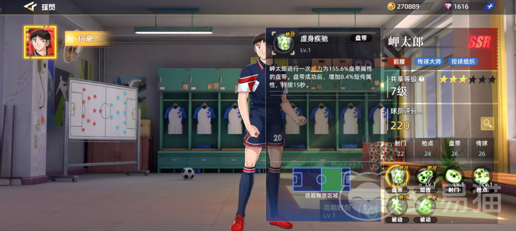 由于基础评分较高,岬太郎初始星级也相对领先,四项关键属性——射门、抢点、盘带与传球的基础数值均超过20点。其中,盘带和传球两项更是达到了26点的高水平,使其在中场组织与推进过程中能有效压制对手前腰球员。射门属性为22点,足以支撑一定的进攻威胁;而24点的抢点能力也为定位球或传中场景提供了可靠的支援保障。