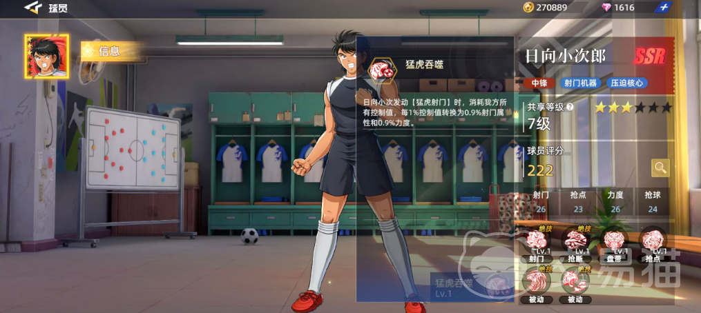 从基础属性来看,日向小次郎在射门与力度两项关键指标上均达到了26分,展现出强大的进攻压制力。抢点和抢球能力也分别有23和24分的表现,整体技术素质十分全面。尽管封堵能力仅为15分,传球属性未达20分,但作为专职中锋,这些短板并不影响他在前场的核心作用。