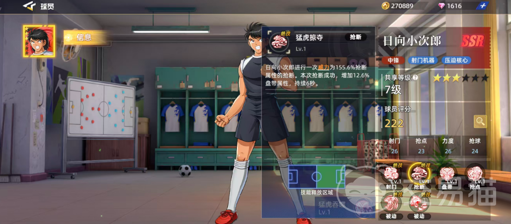 此外,日向小次郎还掌握“猛虎掠夺”这一强力抢断技,适用于右半场尤其是靠近球门的区域。该技能同样具备约155%的威力,并可在成功抢断后为自身增加12.6%的判断属性。虽然此增益状态仅持续6秒,但在短时间内足以帮助他快速完成突破或组织反击,需合理把握使用时机。