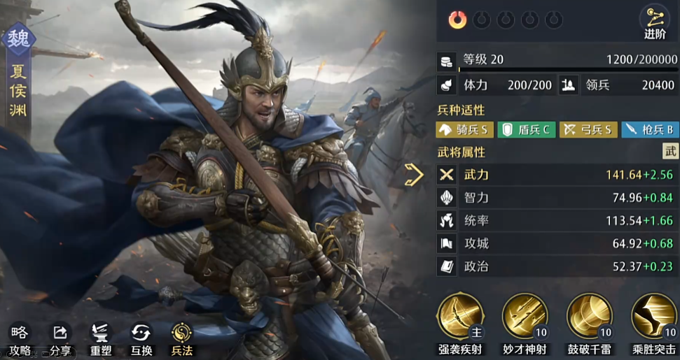 战斗过程中,可利用突击机制集中火力进行18秒高强度输出,力求在短时间内完成击杀。若未能达成斩杀目标,也可选择灵活撤退,避免损失。配合“破军之志”技能,主将夏侯渊还可额外获得50%的伤害加成,将其输出能力推向极致。整套阵容的核心逻辑在于张辽与曹操的协同作用,二者共同为夏侯渊创造最佳输出环境,实现伤害最大化。