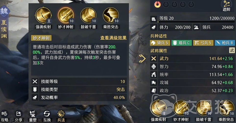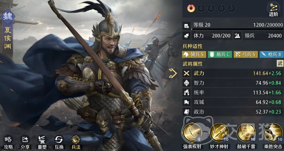 夏侯渊在此体系中承担主要物理输出职责。其主动战法“妙才神射”可在普攻后为自己提供持续3秒的武力增益,提升幅度为15%,有效增强后续技能释放的伤害表现。再配合“雷鼓破千”的增伤效果,中期可额外获得25%的物理伤害加成。两项叠加后,总物理伤害提升接近40%,使他在短时间内打出极高爆发。