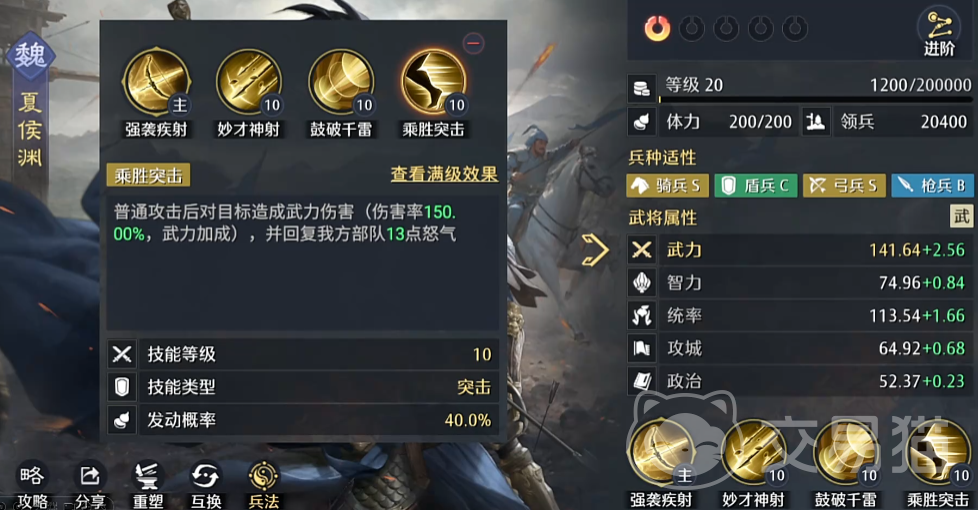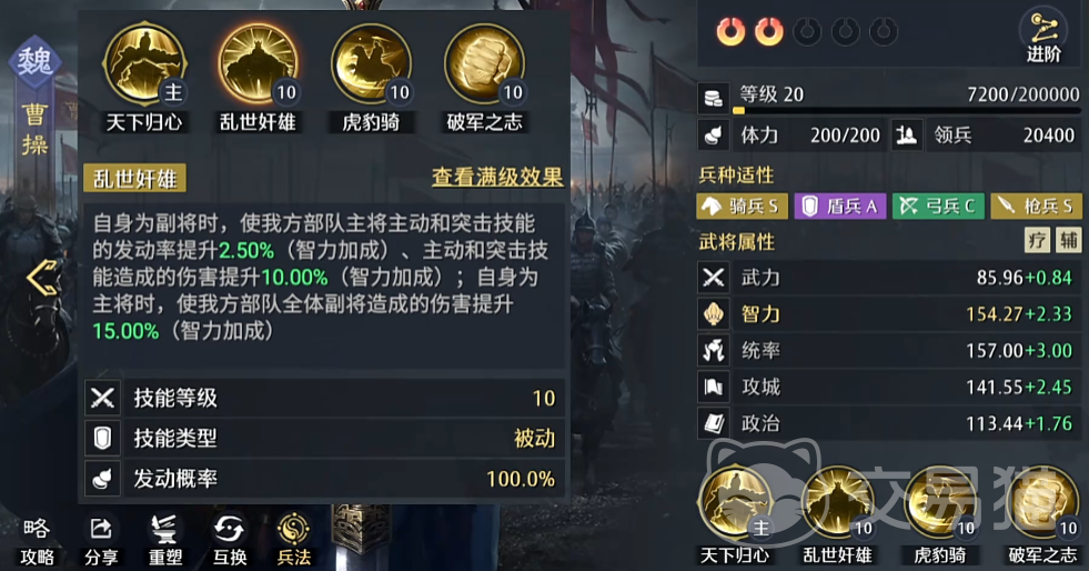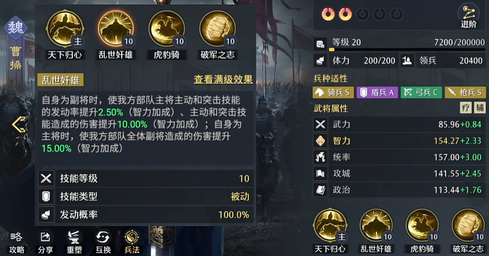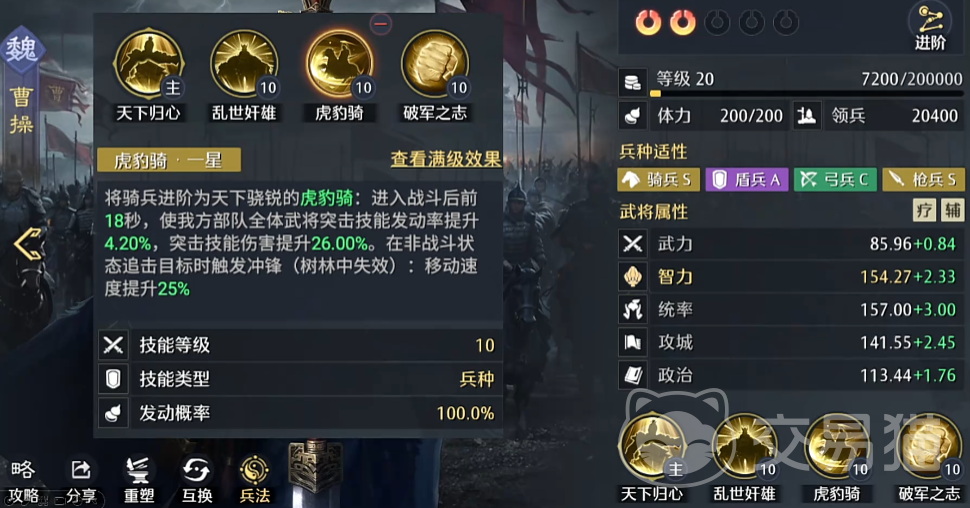 曹操在队伍中担任辅助核心角色,其自带技能可提升我方全体主动战法与突击技能的发动概率,并额外增加10%的相关伤害。这意味着在夏侯渊已有40%增伤的基础上,还能再获得10%的伤害加成,综合提升达到50%。同时,若搭配“虎豹骑”技能,可进一步提升突击触发率并强化技能伤害输出。此外,曹操还具备提升部队行军速度的效果,有利于地图机动与资源抢占。